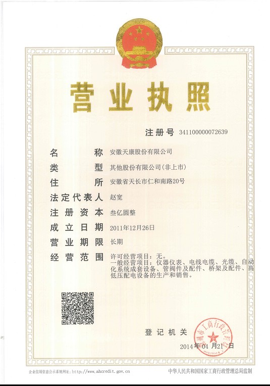 安徽天康股份營業(yè)執(zhí)照正本